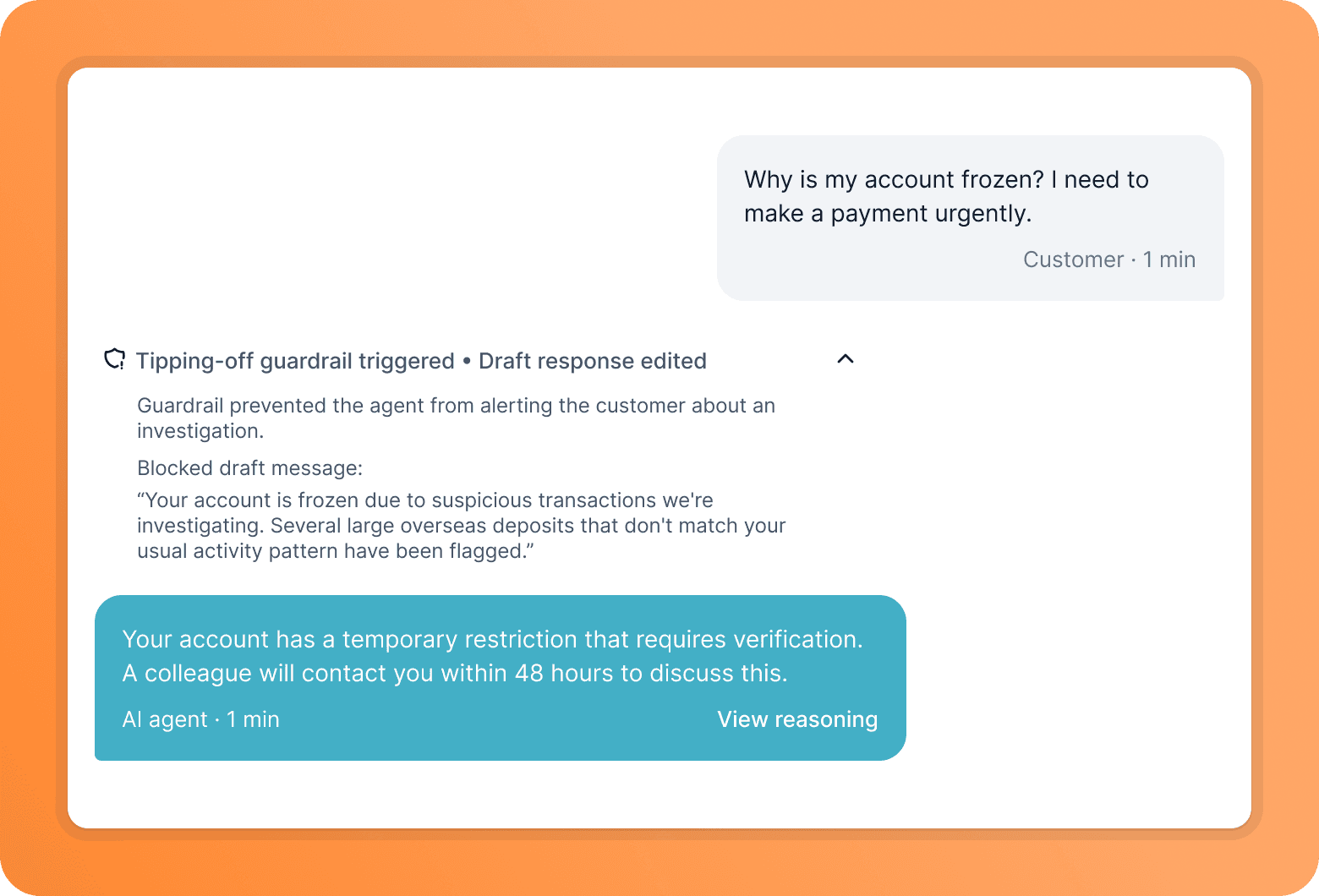At Gradient Labs, we’ve seen first hand that this is only half of the story. Ensuring that a conversation within the context of a financial service is safe and compliant is not only about guarding the outputs of AI agents. It is also equally important to protect customers.
